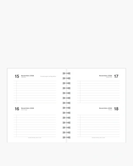 - Encadernação com espiral do tipo wire-o de metal, estilo bipartido e em cor harmonica com a estampa;.
