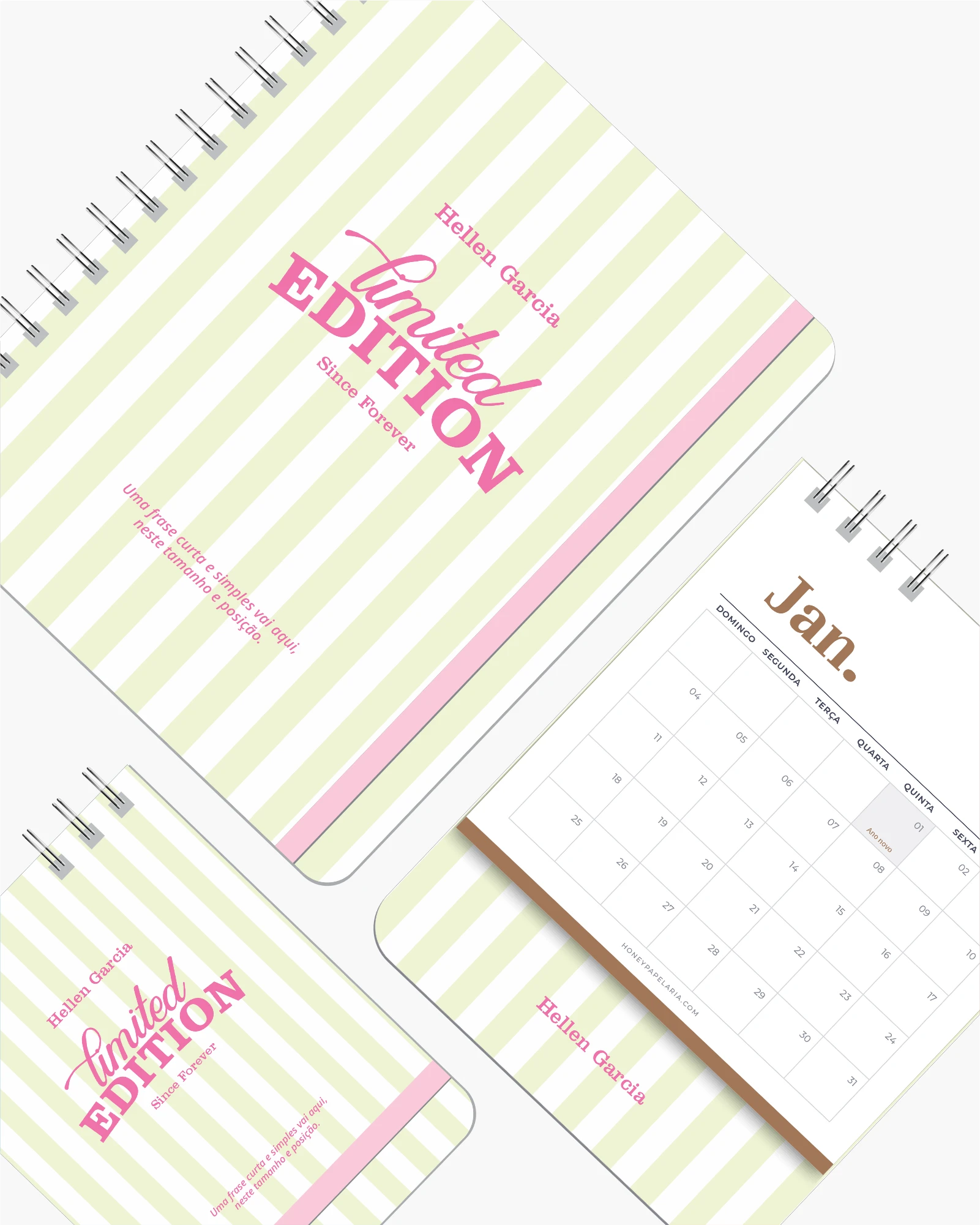 - No calendário, o espaço de nome na base é pequeno e por isso, ele não recebe frase, caso opte por uma frase no seu kit (apenas nome/iniciais). Isso evita a sobrecarga visual.