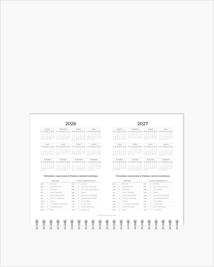 Nosso Planner Diário 2026 Jurídico é produzido em papel offset 75g (gramatura tradicional), tem visão diária (1 dia por página) e ferramentas funcionais como Calendários com feriados e dias comemorativos, Planejamento anual, controle financeiro em duas paginas e paginas para anotações. Anda é acompanhada de fita marca pagina em tecido para auxiliar na abertura da pagina do dia em uso.